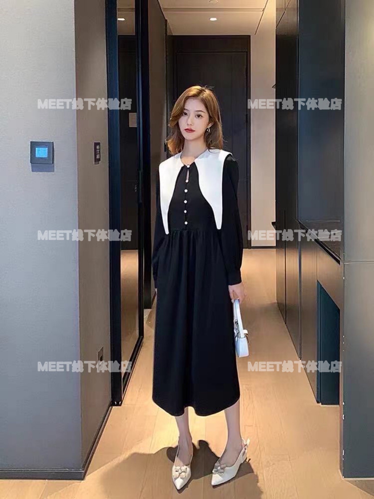 黑色娃娃领可拆卸收高腰长袖设计感连衣裙女2021秋季新款法式长裙热门设计联盟服务商