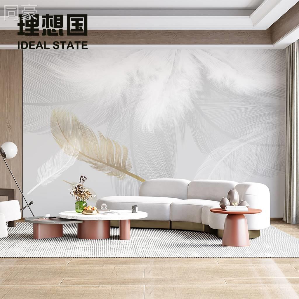 简电视背景墙壁厅纸蓝色羽毛墙沙布客发卧GOW室约墙纸影视墙定制热门设计联盟服务商