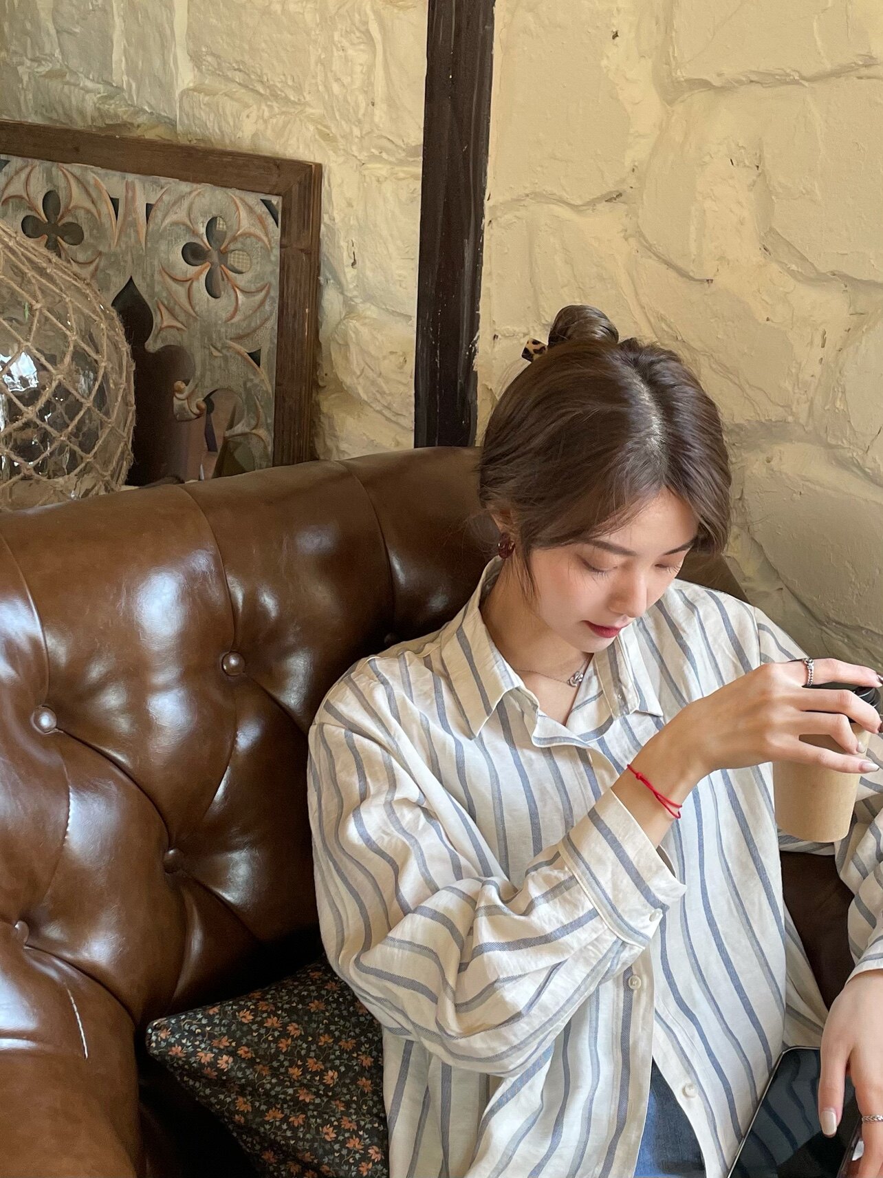 砂剔 设计感慵懒蓝灰条纹衬衫 韩版宽松休闲长袖开衫上衣女热门设计联盟服务商